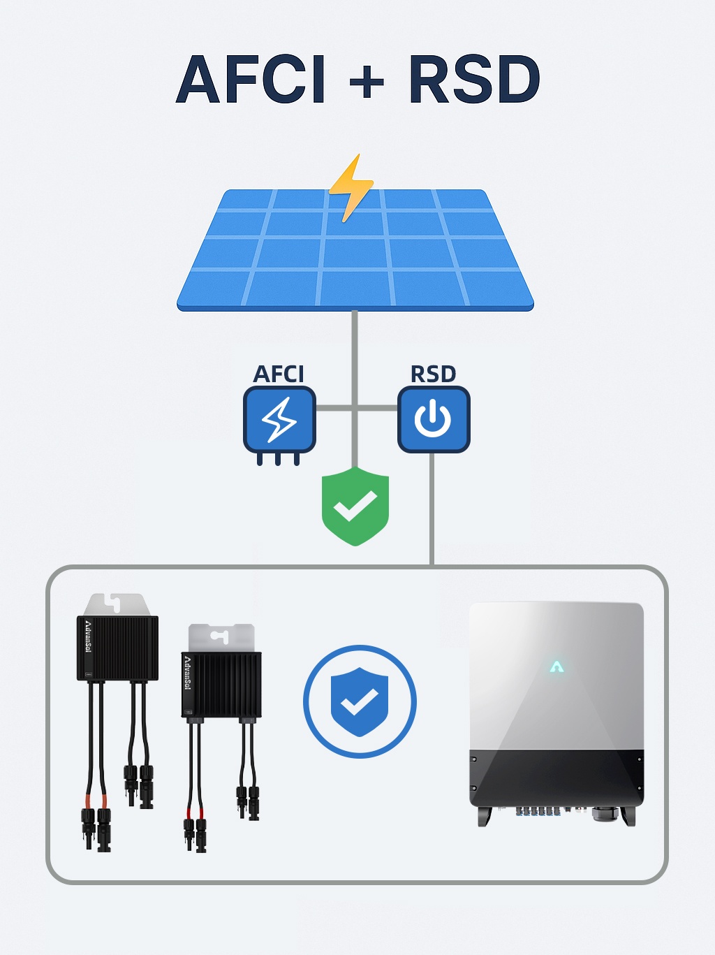AFCI is responsible for detecting arc faults and triggering protection, while RSD executes shutdown and isolation. Together, they form a full-chain protection system from detection to response.
