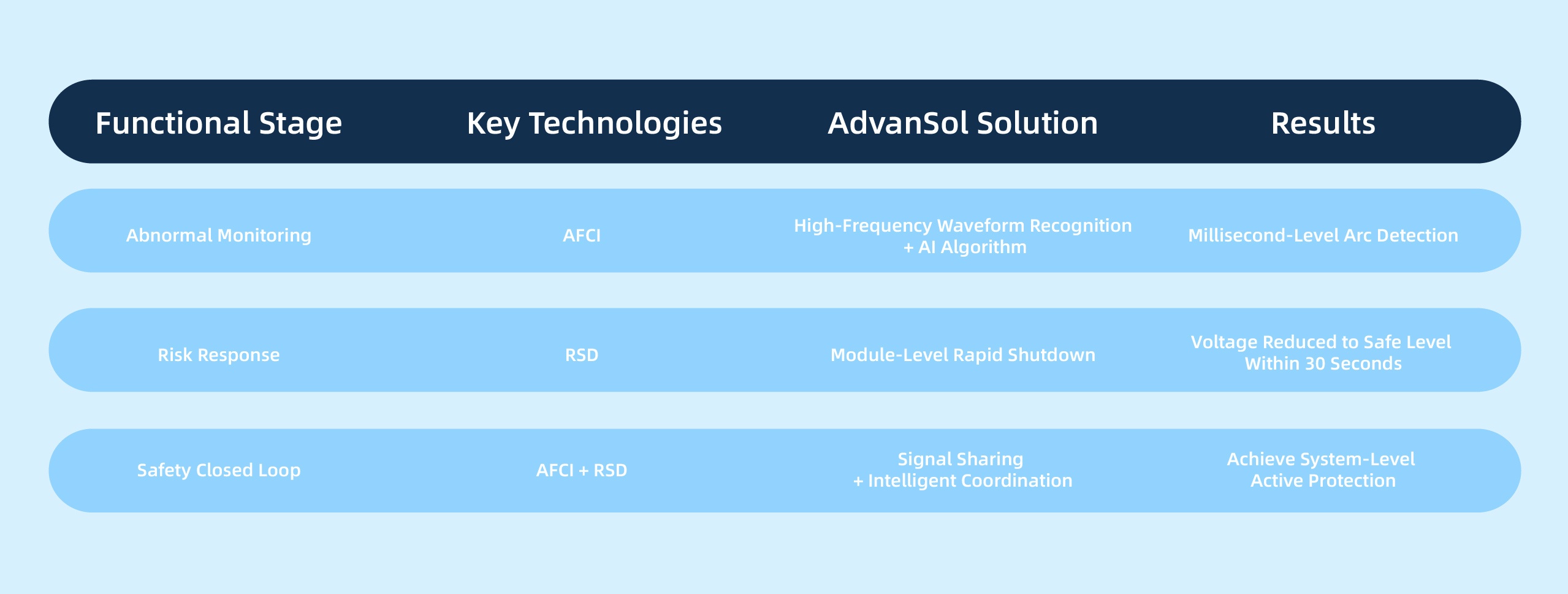 AdvanSol builds a dual safety mechanism with AFCI + module-level rapid shutdown: AFCI continuously monitors DC arc faults and quickly identifies abnormal currents, while the module-level shutdown reduces the high-voltage circuit to a safe voltage within 30 seconds, effectively minimizing fire and electric shock risks.