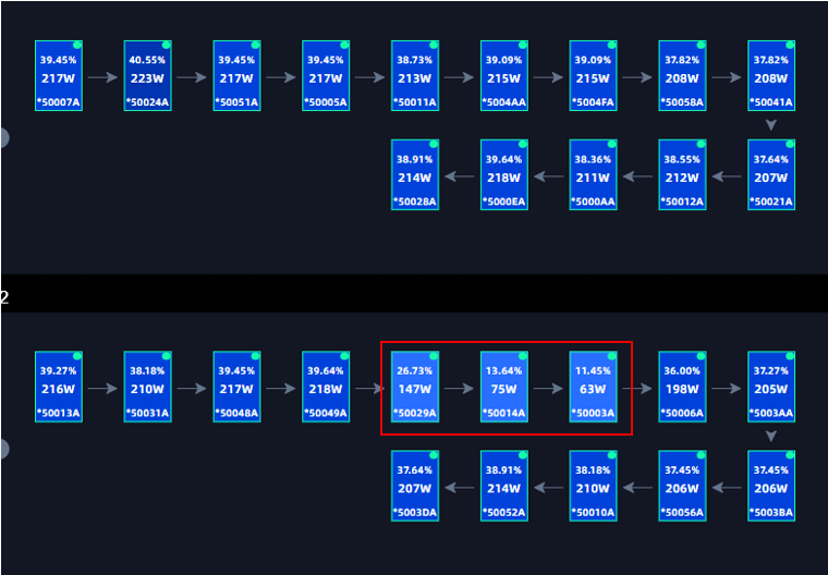 通过AdvanSol Acloud云平台的组件级实时数据可以清晰看到,在安装MRO优化器后,受遮挡的低功率组件不再影响正常组件发电,即优化器挽回失配损失产生的发电量增益。
