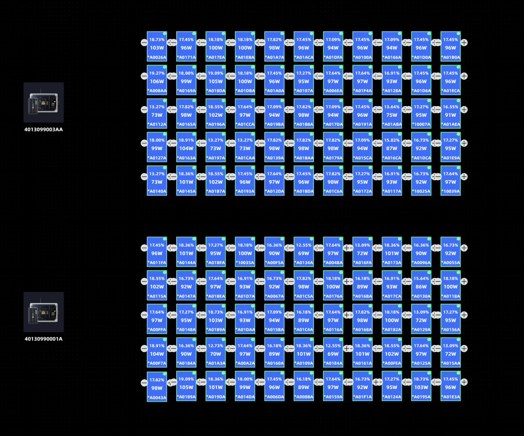 在遮挡条件下,传统系统中组件易被旁路,出现大面积0W输出现象。而通过MRO优化器的组件级MPPT控制,能够有效规避阴影导致的串联失配问题。